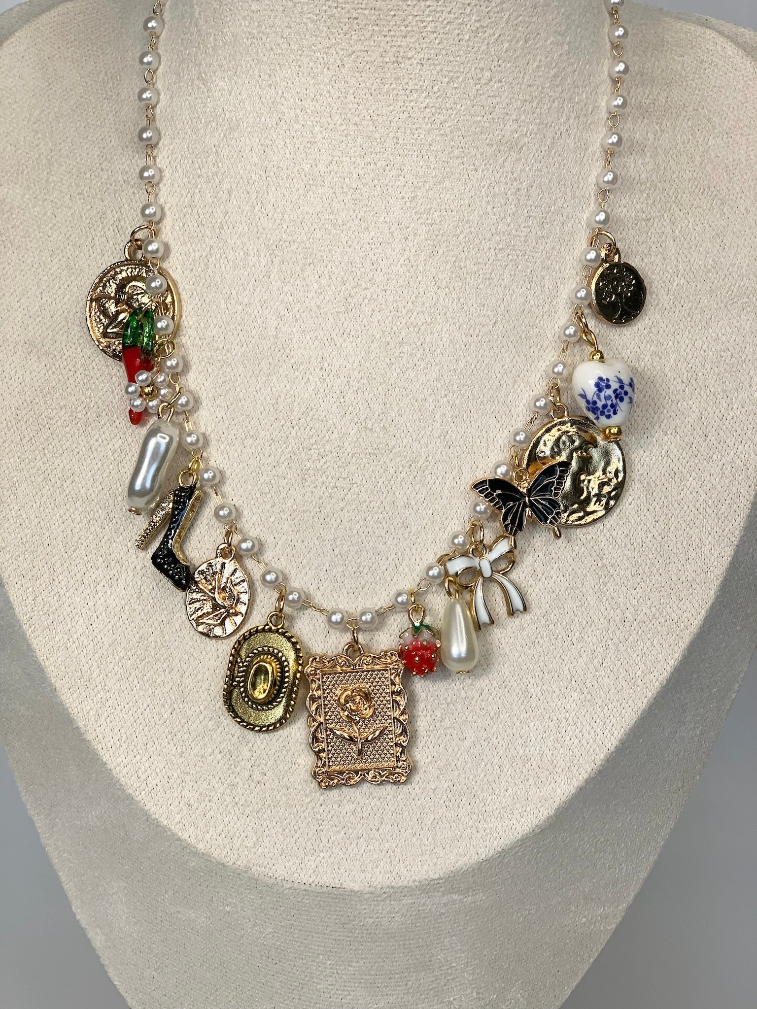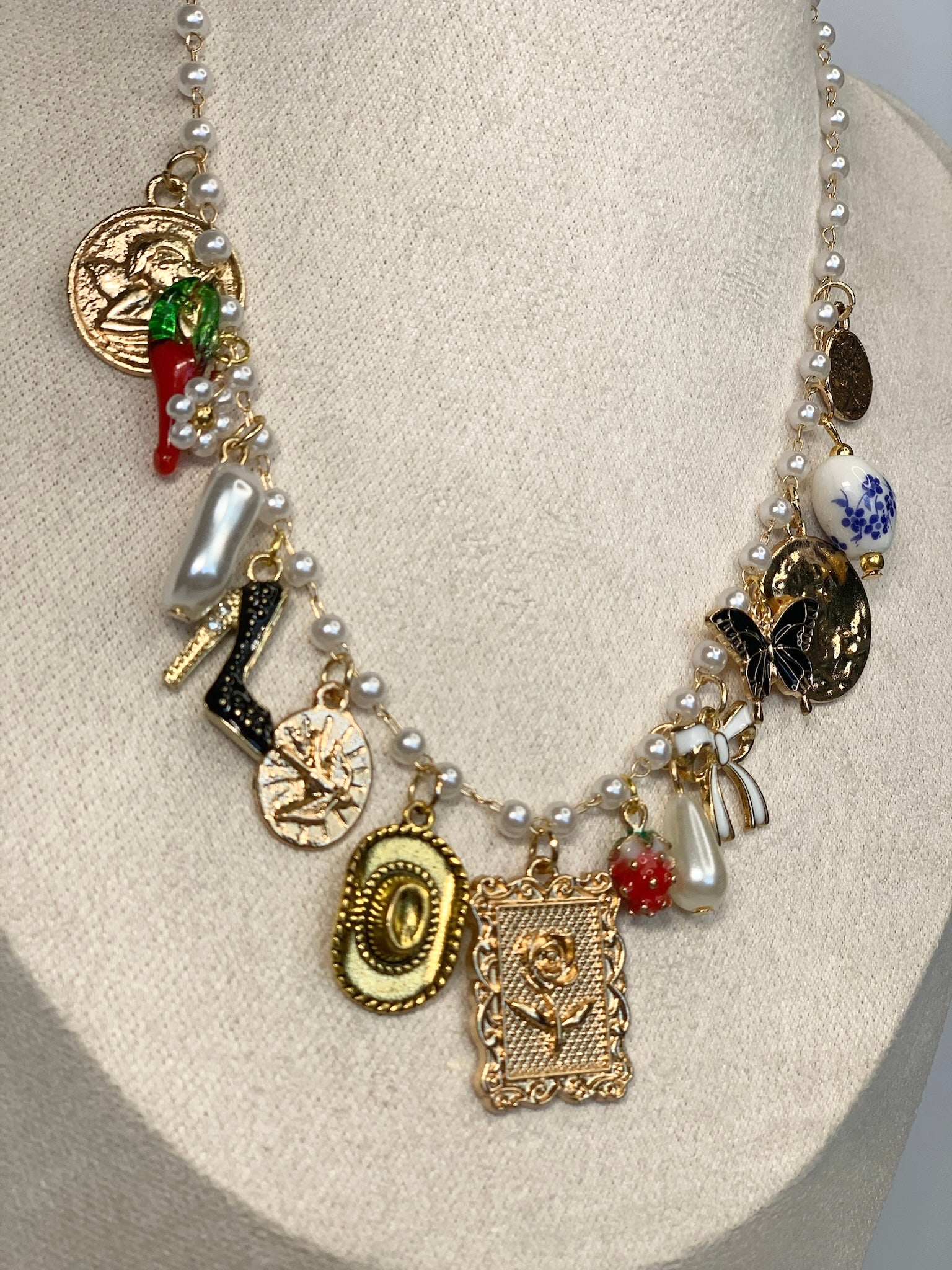 get ready to shine with the Annie, get your charm necklace, a playful and chic piece that is all about capturing the adventure, spirit of the girl who’s always on the go this delightful necklace features a mix of whimsical charms, including a cowgirl hat, high heel, chili pepper, bows, and butterflies! The Annie get your charm necklace can bring out your bold, fearless and fun loving side.