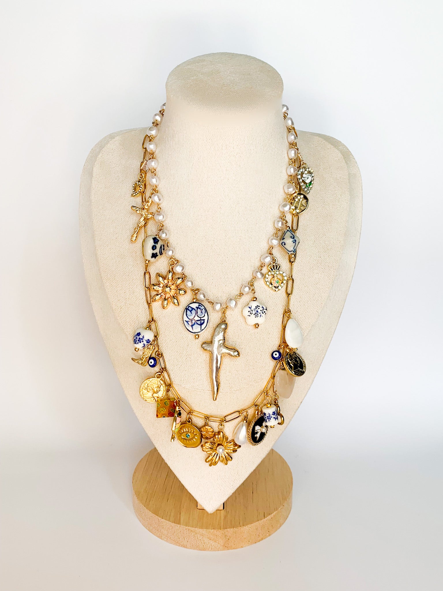 Gracefully layered and richly symbolic. The pro of Providence is a double strand charm necklace that blends celestial elegance with timeless meaning at its heart, Lisa striking opal Cross statement, pendant, radiating a ethereal fire and spiritual depth the strands are adorned with luster, pearls alternating blue and white beads, and a scattering of gold charms and antique style coins, that evoke blessings, guidance, and fortune each detail is thoughtfully placed, offering a harmonious balance between divine beauty and vintage allure. This necklace is more than adornment. It’s a symbol of grace protection and purpose.