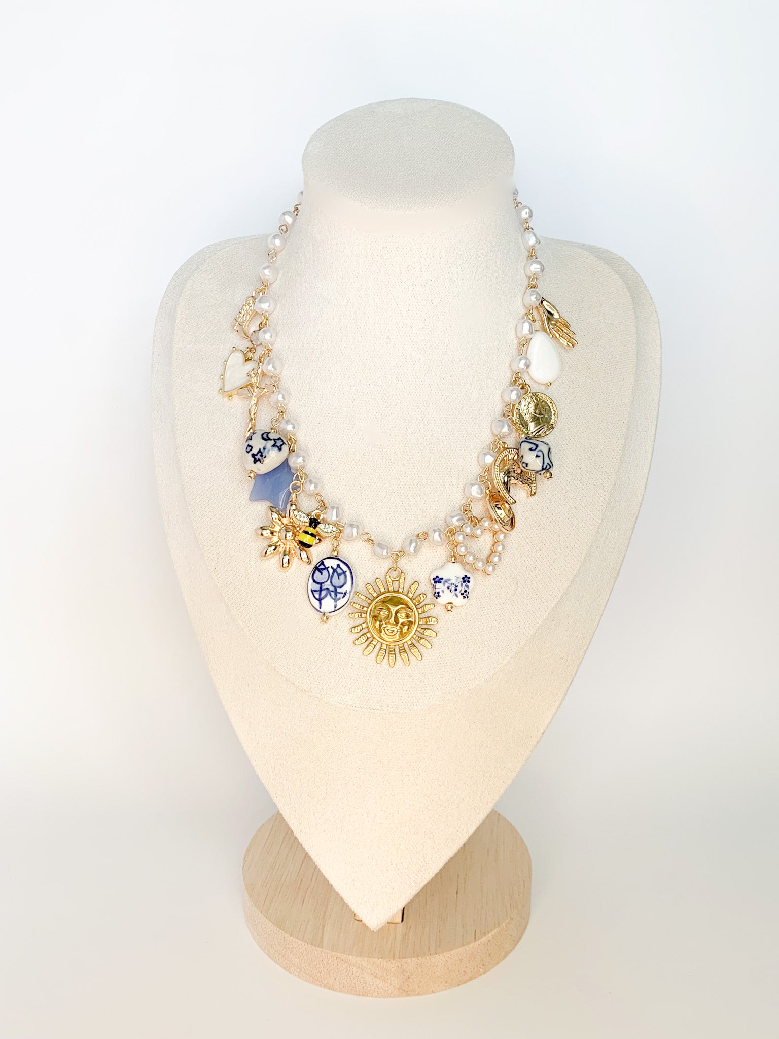Radiating Boho charm this eclectic necklace features a gleaming gold sun pendant as its centerpiece, symbolizing, warmth and energy as scented with delicate blue and white charms for a touch of coastal serenity. It also includes a vintage style coin for a hint of old world and a miniature cowgirl hat, adding a playful western twist, perfect for free spirits who blends sunshine, adventure, and style