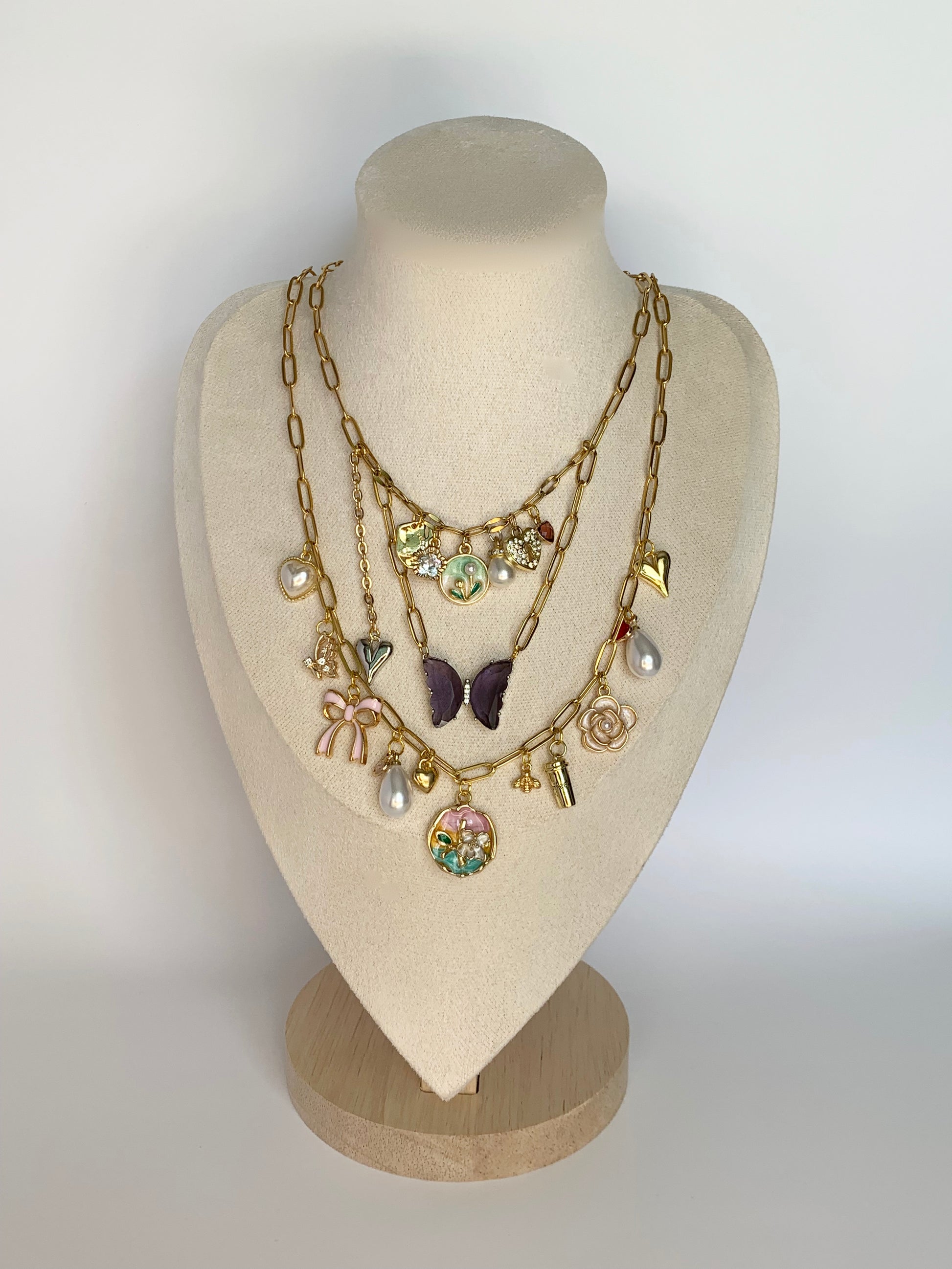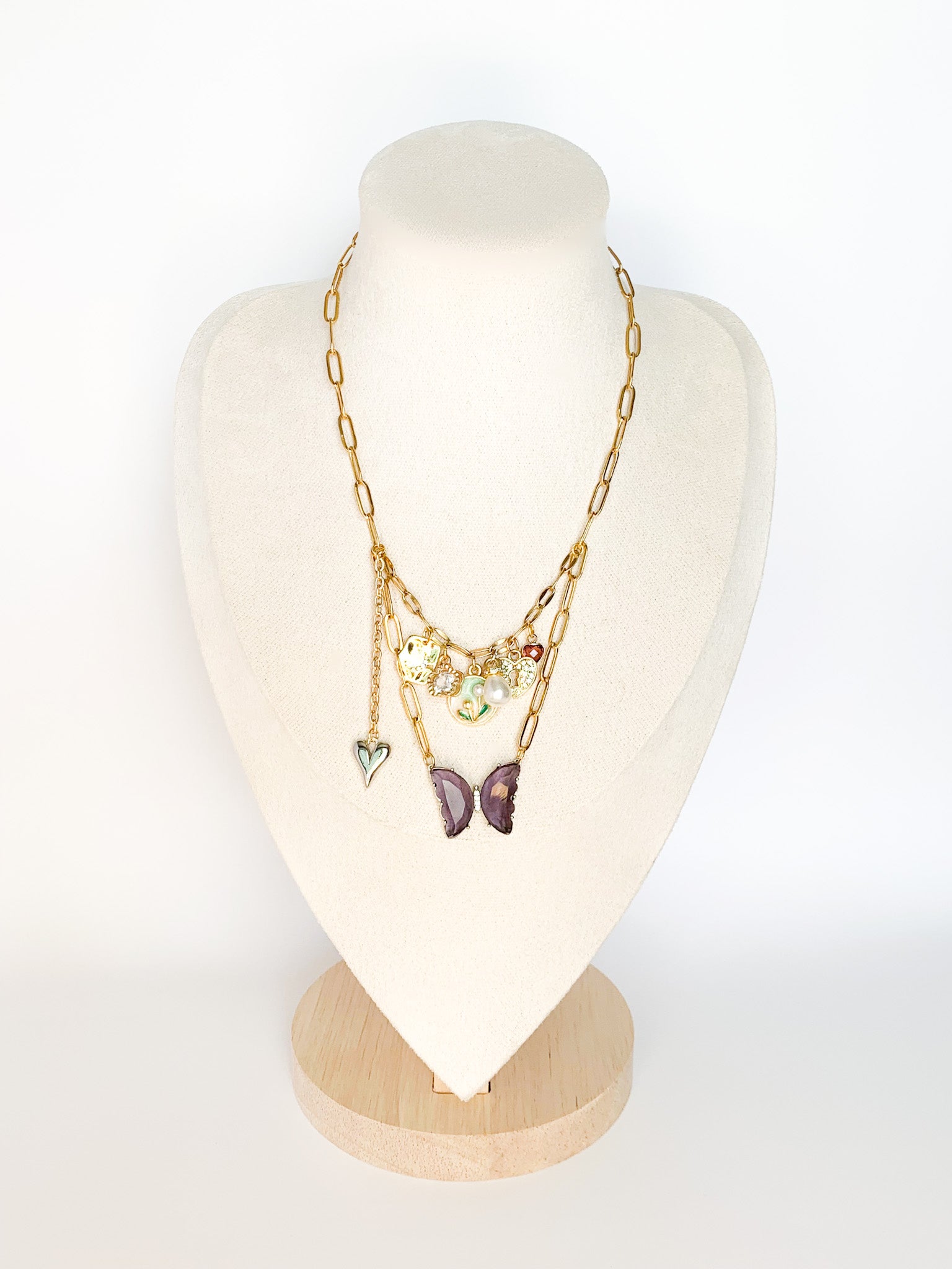 this enchanting necklace, captures the delicate harmony of nature featuring intricately crafted butter, butterflies, poised among elegant flowers. Each charm is sculpted with grace and shimmer in the light. The charms textured surfaces, lend a life like botanical charm. This necklace is made with a mix of polished metals— gold, silver and verdant enamel. The peace evokes the feeling of a secret garden in Bloom suspended gracefully at the collarbone.