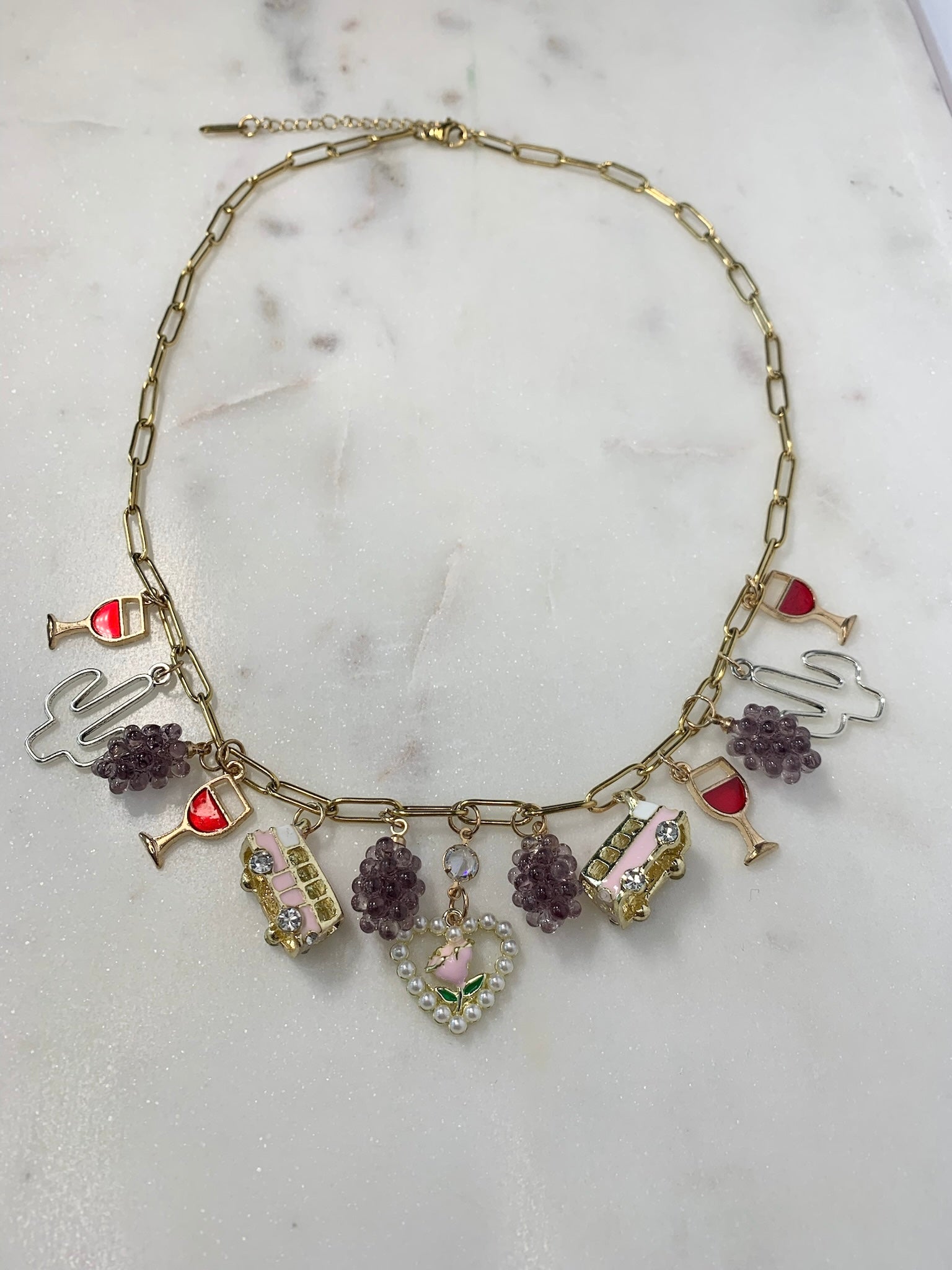 For the girls who know their reds, love a good rosé, and never say no to "just one more glass." The Wine-o is a cheeky-chic charm necklace to wear and celebrate your love for Temecula wine country. Perfect for wine enthusiasts, this necklace features a carefully curated selection of charms that embody the essence of the region's vibrant wine culture. Whether you're brunching, toasting, or just channeling your inner grape goddess, you will need this accessory.